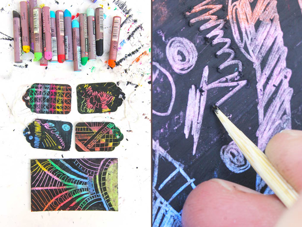 Pour faire une carte à gratter, c’est très simple, il ne vous faut que très peu de choses : des craies grasses et un papier (cartonné dans l’idéal).